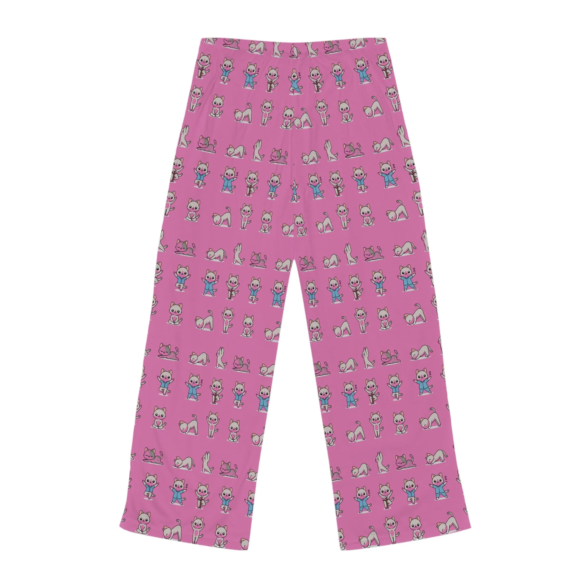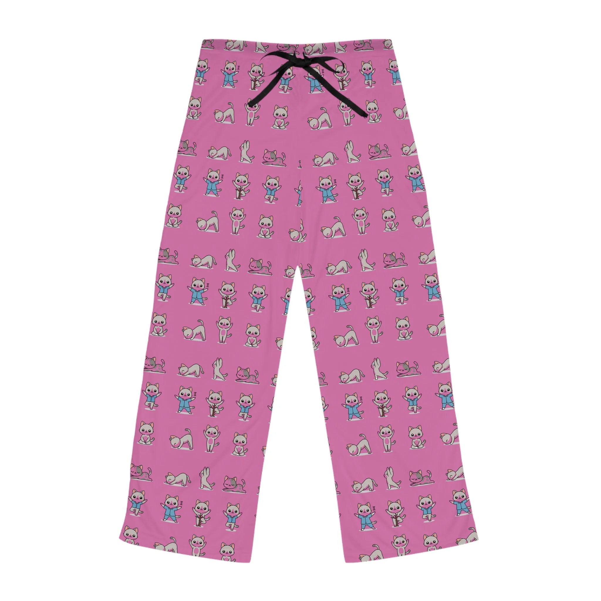 Slide into these pajama pants and let the room fill with quiet joy: tiny, playful kitties moving through yoga poses across a soft pink field. They’re cozy and light, the fabric whispering against skin as you stretch into morning sun or curl up with a book at dusk. The relaxed fit and elastic-backed waist with a black drawstring make them easy to pull on after a long day of work or to wear through a slow weekend ritual. The all-over print keeps the design lively from every angle — each cat in tree pose or downward dog feels like a small companion encouraging breath and calm. These pants blend homey comfort with a touch of whimsy, suited to night routines, lazy Sunday mornings, or gifting a friend who loves cats, yoga, or both.