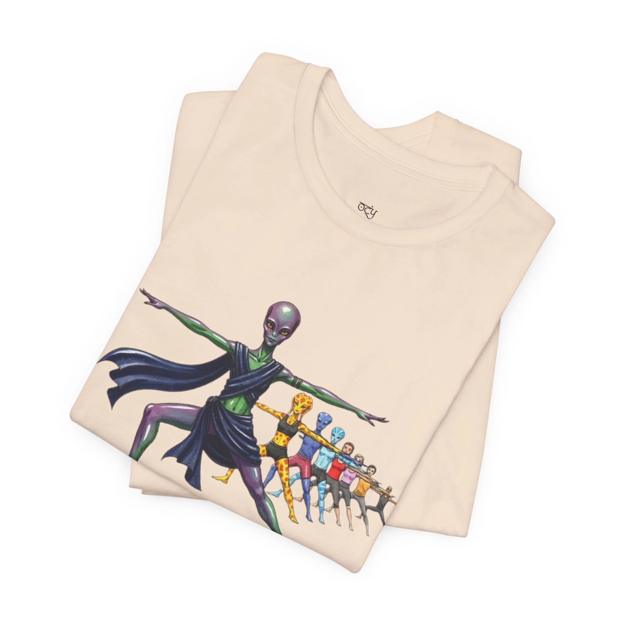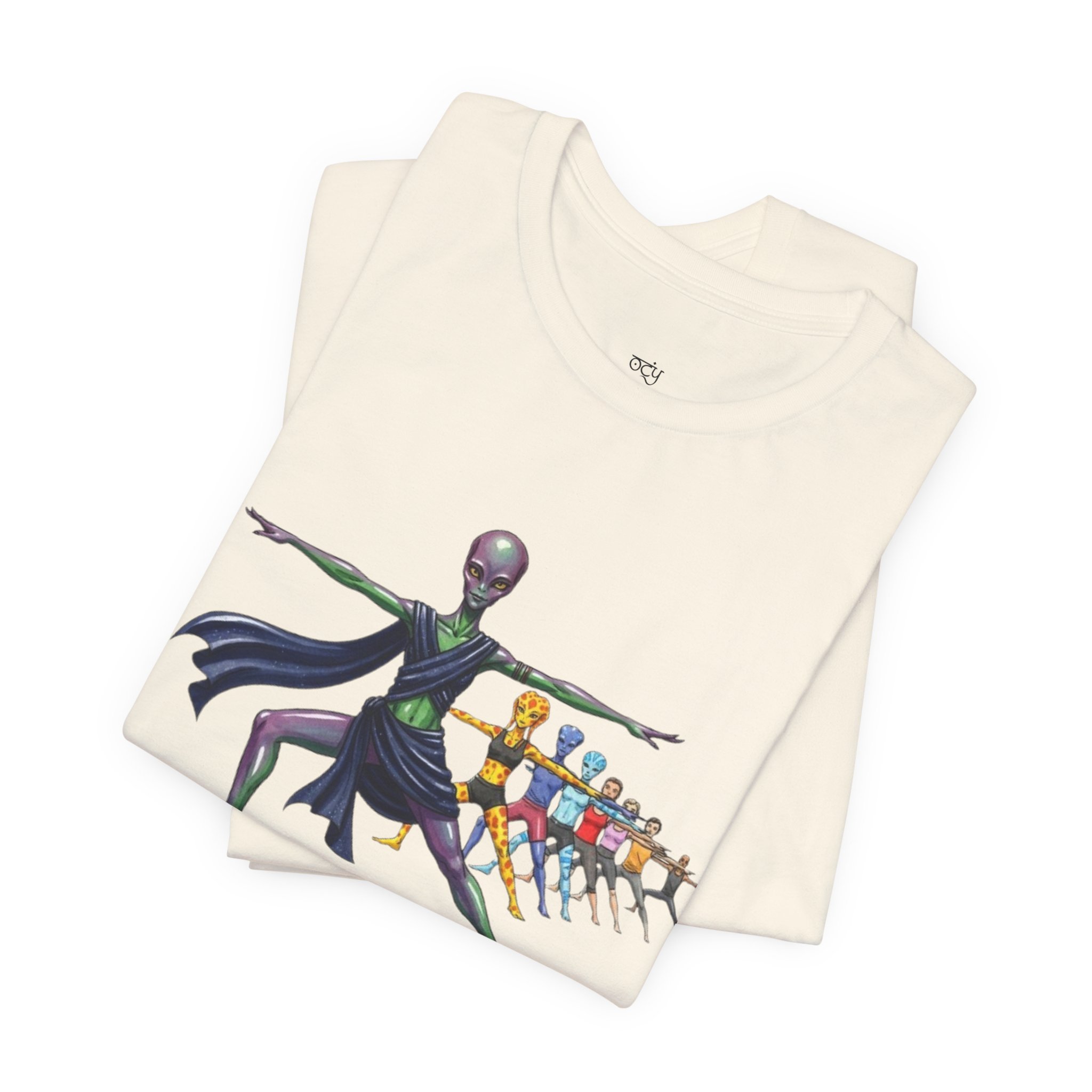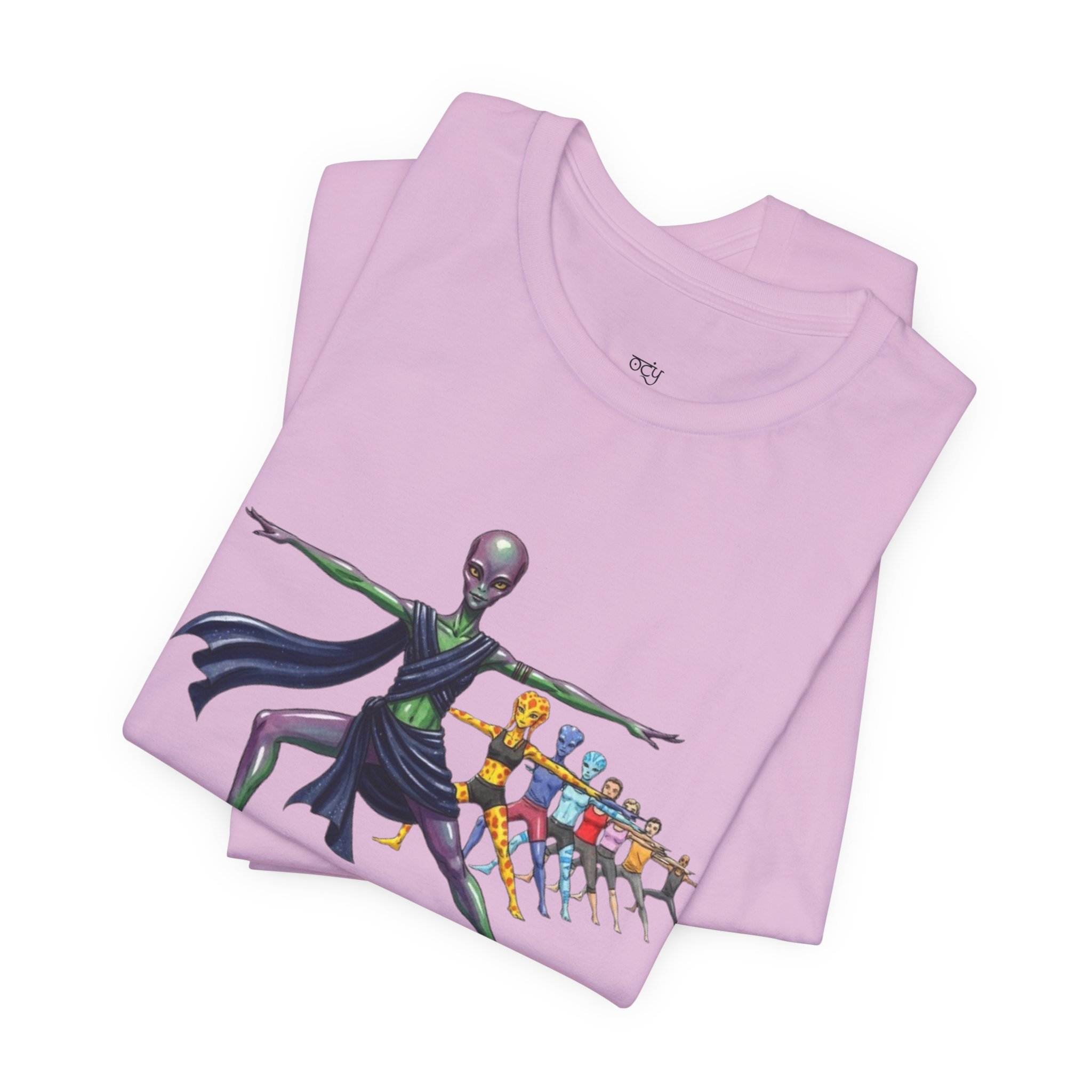Breathe some cosmic humor into your everyday wardrobe with this lightweight tee. Soft Airlume cotton keeps you cool while an alien instructor leads a lineup of colorful recruits through a poised yoga stance—captioned I PRACTICE INTERGALACTIC ALIGNMENT. It reads like a wink to anyone who moves between studio mats and stargazing nights, pairing effortless comfort with playful, detailed sleeve and label printing. Wear it to class, to a sci‑fi meetup, or on a clear night when you want to feel a little more aligned with the universe.