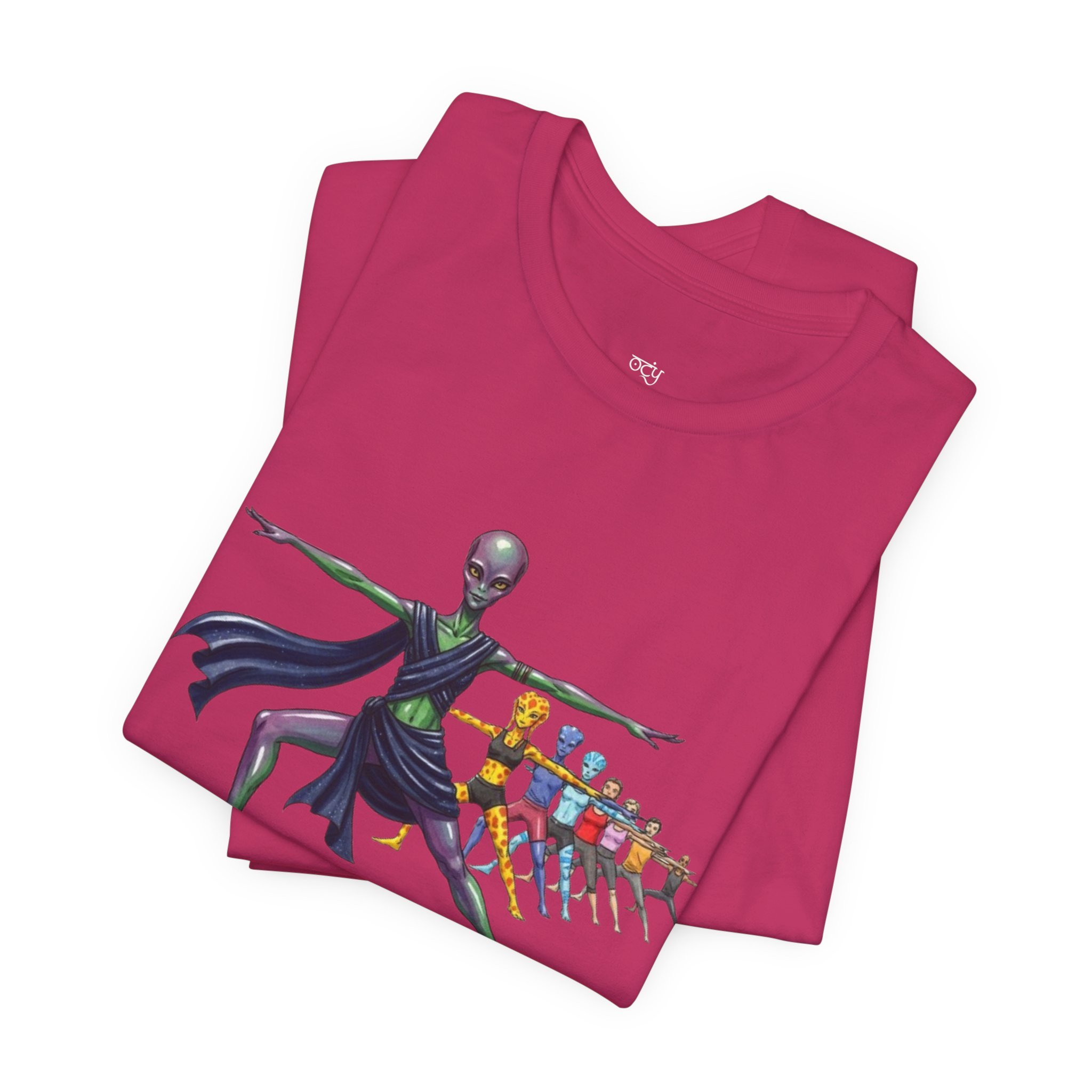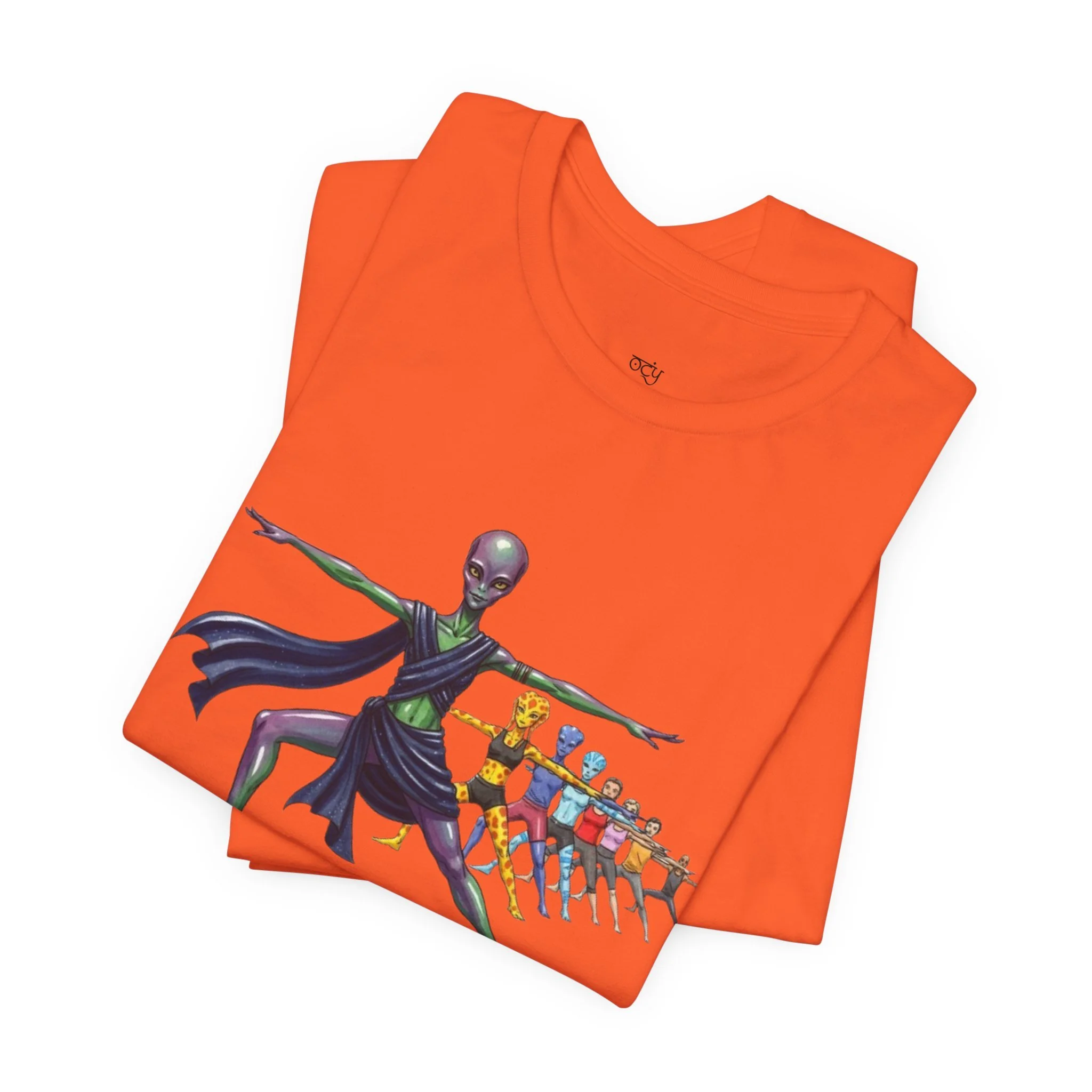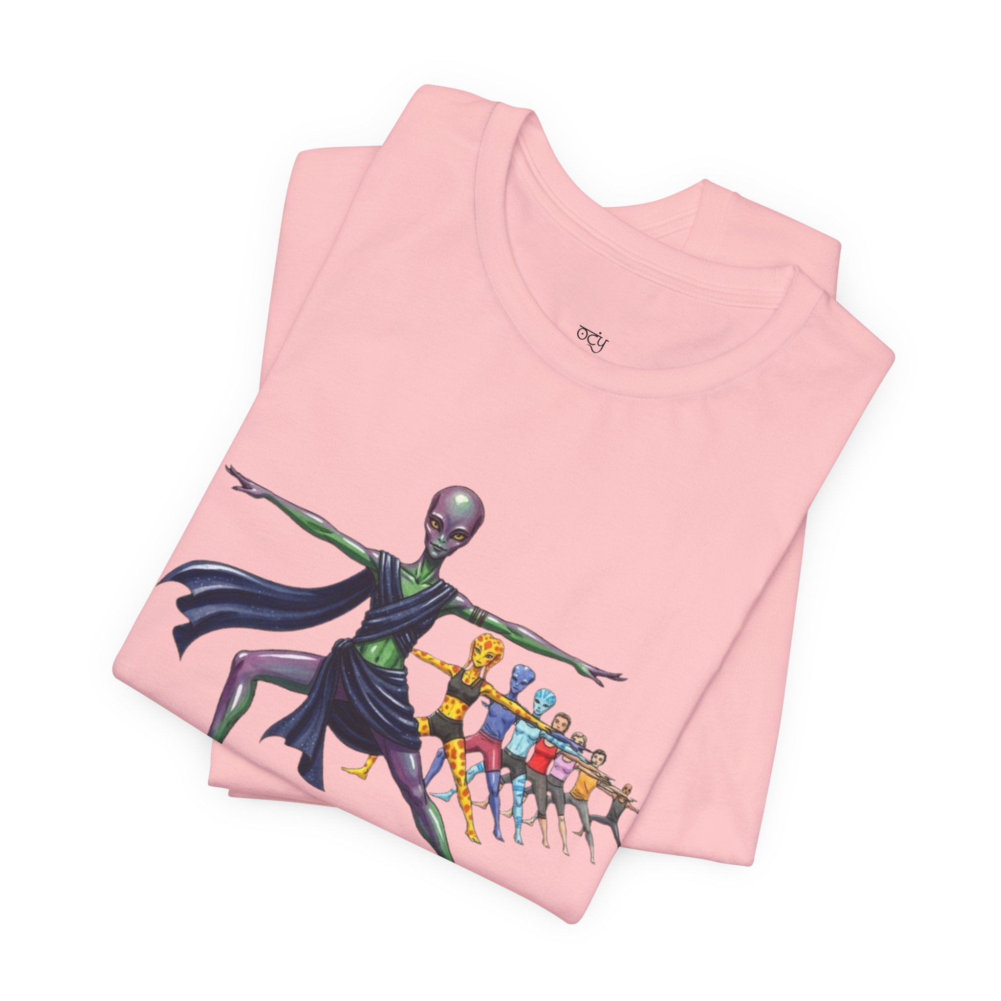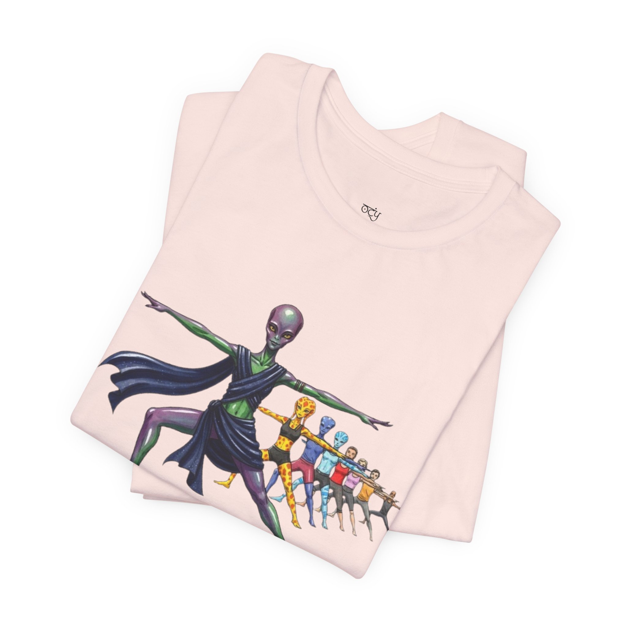 Breathe some cosmic humor into your everyday wardrobe with this lightweight tee. Soft Airlume cotton keeps you cool while an alien instructor leads a lineup of colorful recruits through a poised yoga stance—captioned I PRACTICE INTERGALACTIC ALIGNMENT. It reads like a wink to anyone who moves between studio mats and stargazing nights, pairing effortless comfort with playful, detailed sleeve and label printing. Wear it to class, to a sci‑fi meetup, or on a clear night when you want to feel a little more aligned with the universe.
