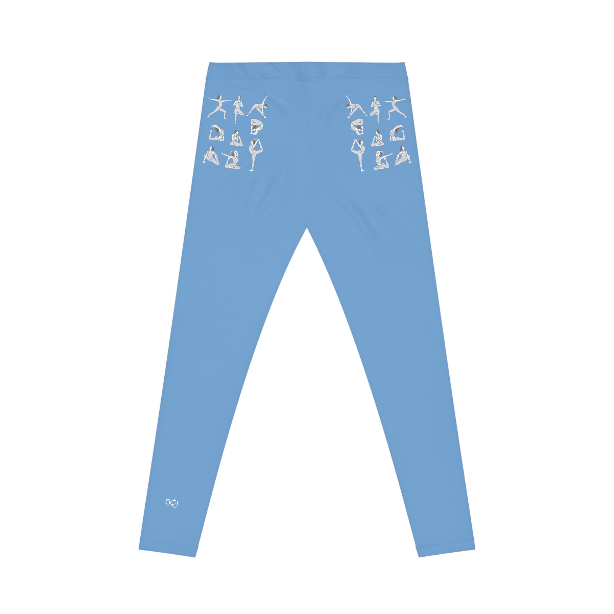 These light blue active leggings move with you. Eight yoga poses spread across front and back create a calm, rhythmic pattern that nods to practice without shouting for attention. The mid-rise, thin elastic waistband sits comfortably at the hips so you can stretch, bend, and hold poses without fuss. The fabric has a silky finish and vivid, long-lasting printing that keeps the pose illustrations crisp through wear and washes. Lightweight, durable, and with a responsive four-way stretch, they feel soft against the skin and return to shape after every session. Wear them to the studio, to a slow flow in the park, or while you cool down with a cup of tea after class — they layer easily under an oversized sweater or pair with a cropped top for a simple, mindful look.