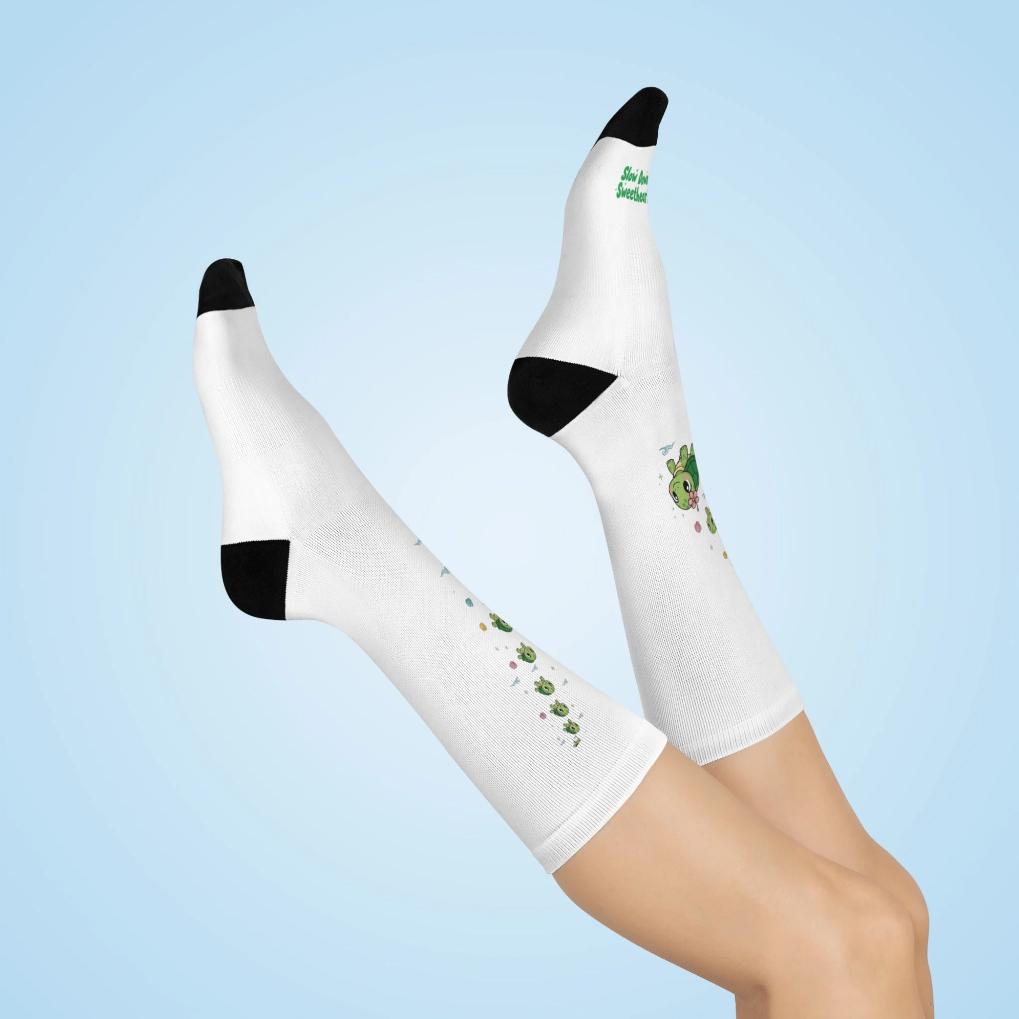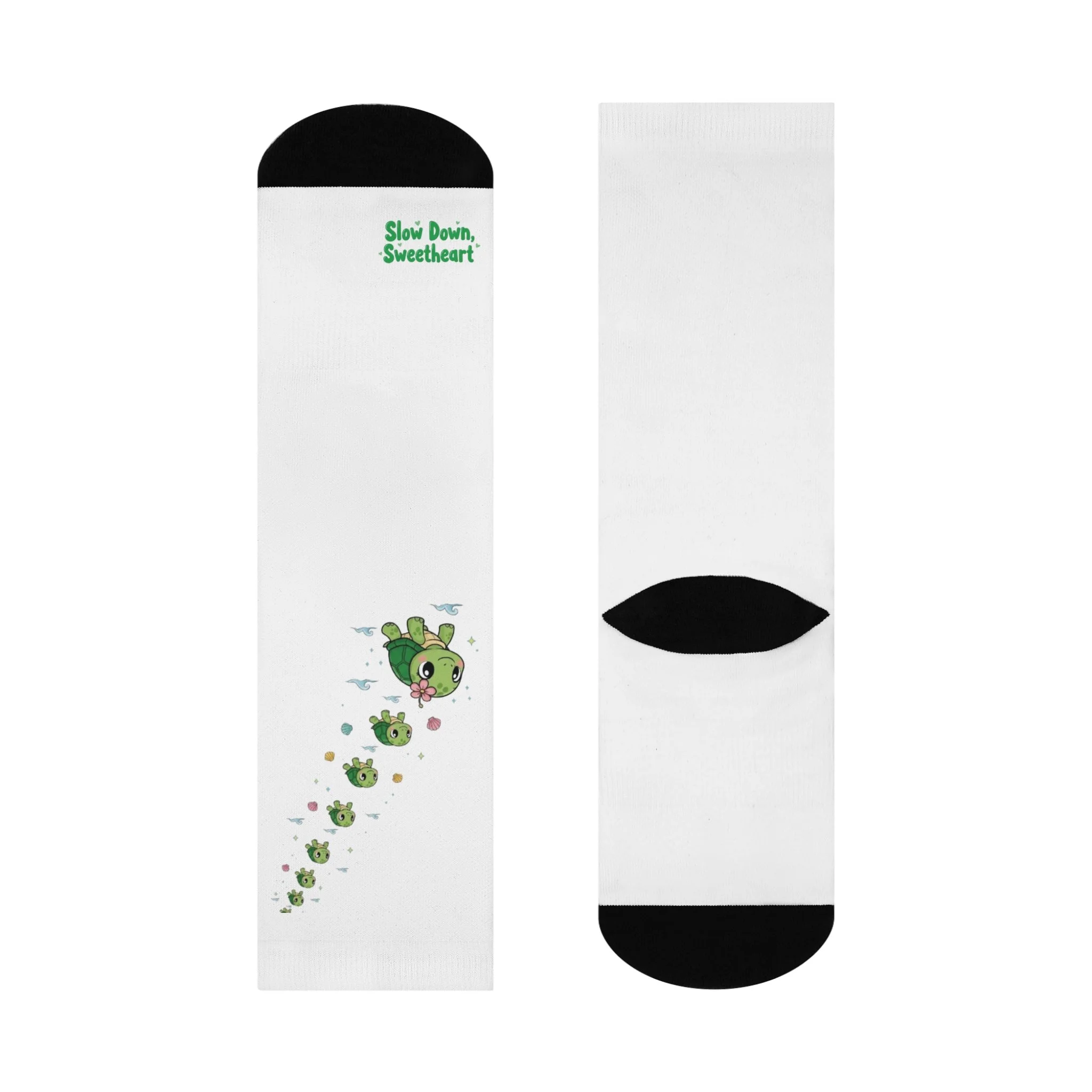 Slide into a slow, cozy moment with these cushioned crew socks patterned with sleepy, curling cats. Softly compressed around the arch and cushioned underfoot, they bring quiet comfort to mornings spent with a mug, long evenings of reading, or slow walks between errands. The all-over print wraps each sock in playful, detailed illustrations of napping kitties, while solid black toes and heels keep the look grounded. Stretchy, smooth fabric hugs your feet without pinching, and the bright, crisp colors keep those cat faces lively wash after wash. They feel like a small, warm ritual — the easy accessory that makes everyday routines feel gentler.